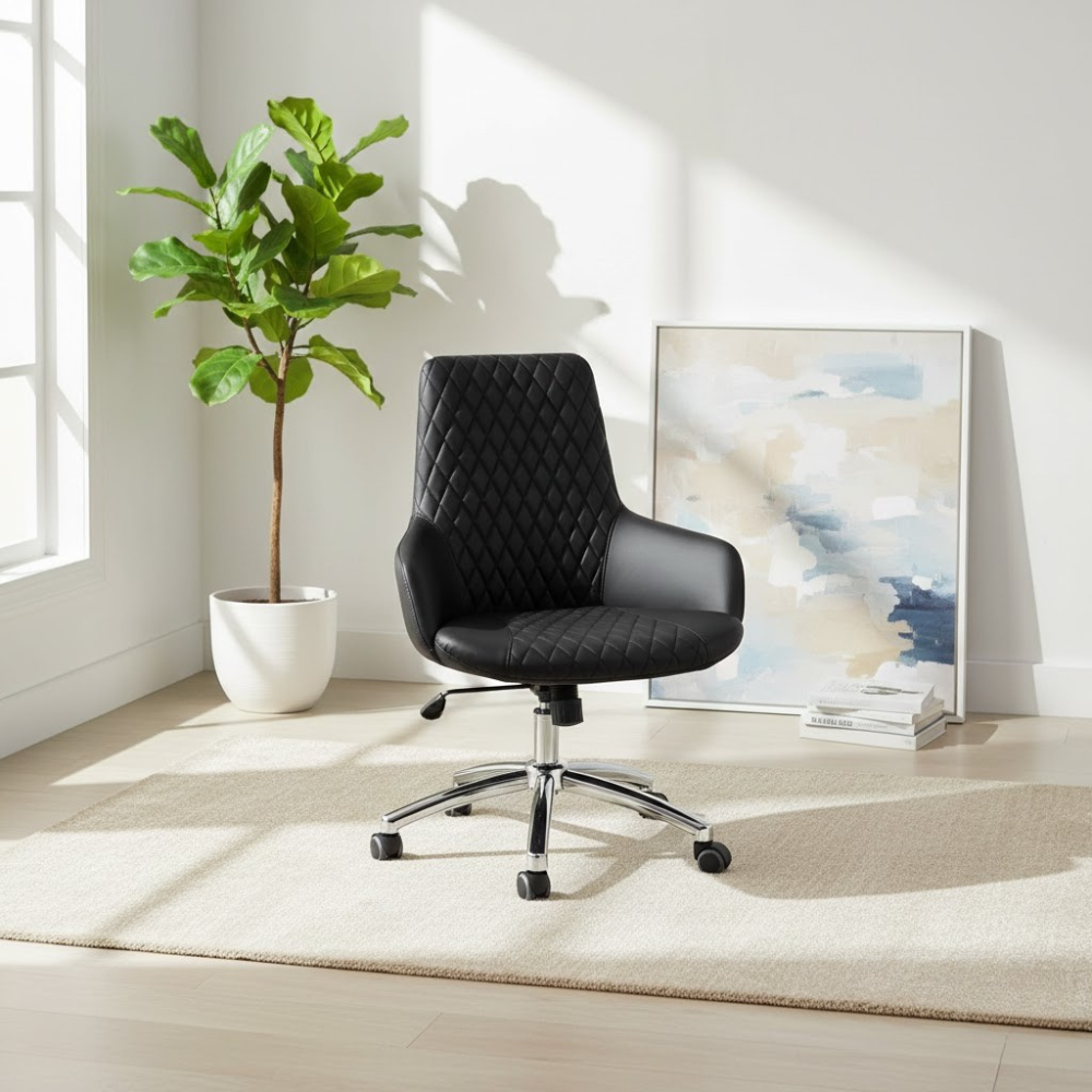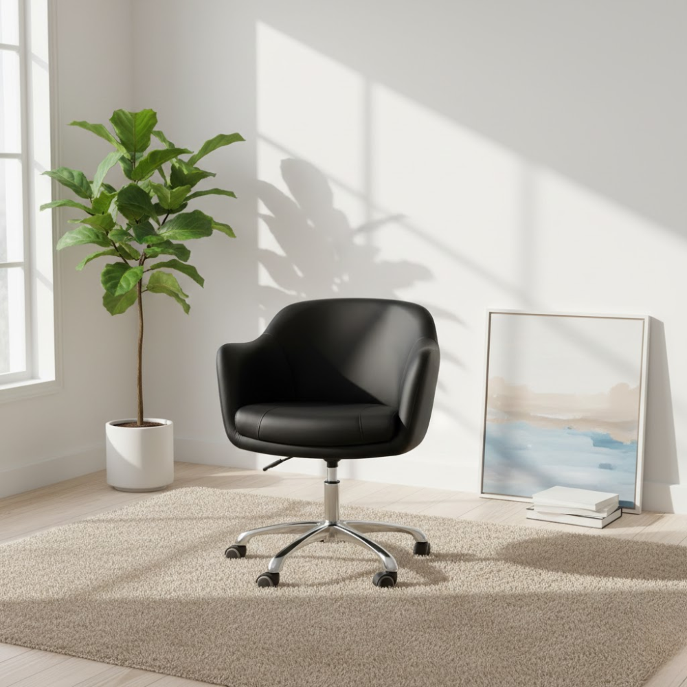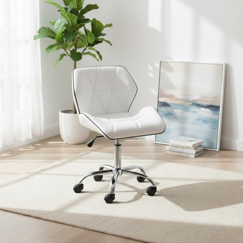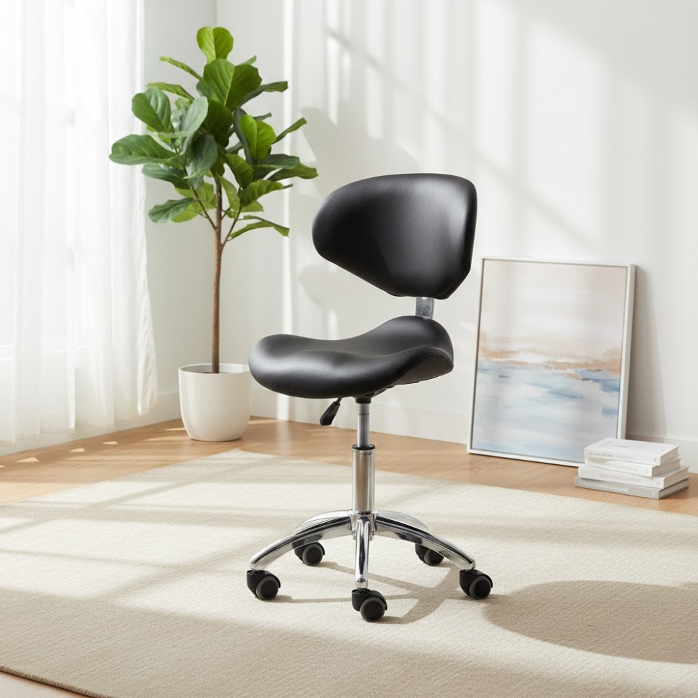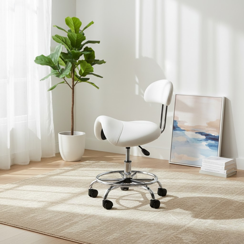 Description: ✦Ergonomic Saddle Seat – 16” x 19”: Promotes healthy posture and reduces lower back strain during long working hours. ✦Adjustable Height: 18” – 22”: Smooth hydraulic lift mechanism allows you to customize your seat height for any workstation. ✦Chrome Star Base with 5 Caster Wheels: Durable, stylish, and ultra-stable—glides effortlessly across all floor types. ✦Compact & Functional Design: Perfect for tight workspaces while offering full mobility and support.