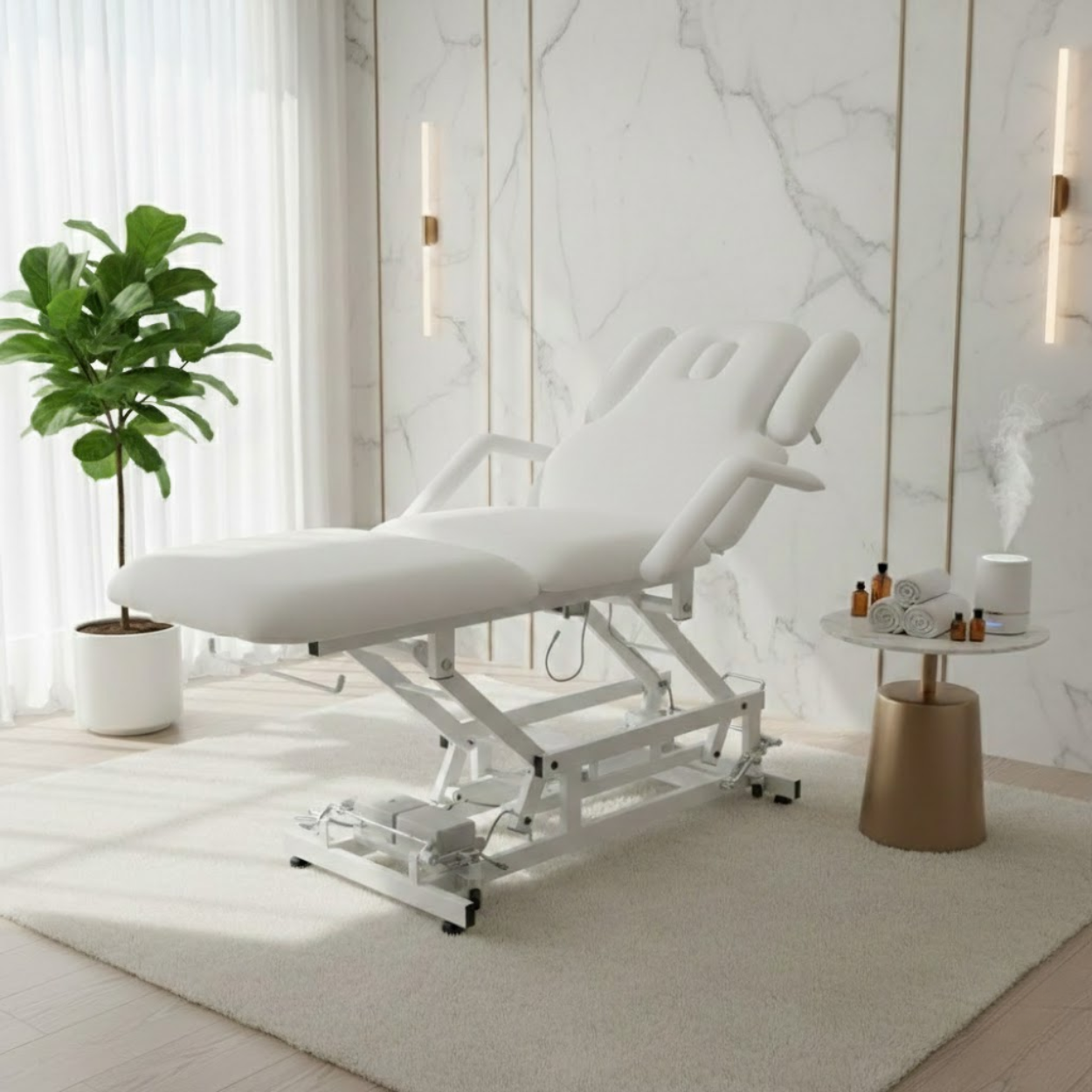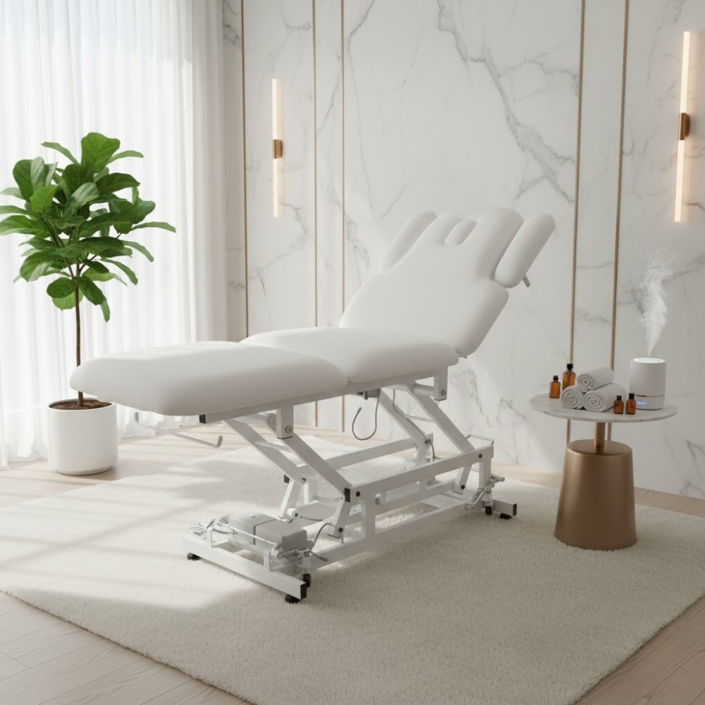 Description: ✦Electric Height Adjustment: Smooth, motorized lift system allows you to adjust bed height with ease—ideal for multitasking professionals and enhanced client access. ✦Weight Capacity Up to 350 lbs: Sturdy construction and reinforced framing support a wide range of clients with reliable stability. ✦Manually Adjustable Headrest: Fine-tune client positioning with a flexible headrest—perfect for massage, facials, and therapeutic treatments. ✦Built-In Face Opening with Removable Headrest Pillow: Offers optimal comfort for face-down services; the plush pillow can be removed as needed. ✦Retractable Wheels: Move and reposition the bed effortlessly when needed—then lock it securely in place during use.✦Fully Electric with 3 Motors: Independently control the height, backrest, and leg-rest for optimal treatment positioning and client comfort.