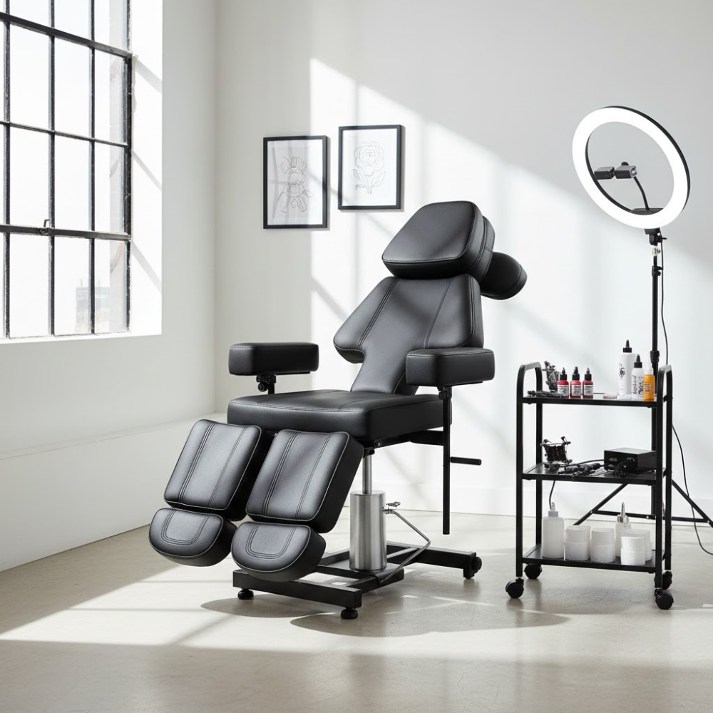 Description: ✦Ergonomic Design: Padded, contoured headrest, backrest, armrests, and leg supports ensure maximum client comfort during long sessions. ✦Hydraulic Height Adjustment: Effortlessly raise or lower from 18″ to 28″ (approx.) with the foot-operated silver pump for perfect working posture. ✦360° Swivel Base: Smooth rotation allows easy access from any angle without repositioning the chair. ✦Heavy-Duty Construction: Powder-coated steel frame and reinforced joints support up to 450 lbs, ensuring years of reliable service. ✦Easy Maintenance: Waterproof, oil-resistant upholstery wipes clean in seconds—ideal for busy environments. ✦Fully Adjustable: Quick-release levers and knobs let you fine-tune every element—headrest tilt, armrest height, and leg section angle—to accommodate any procedure.