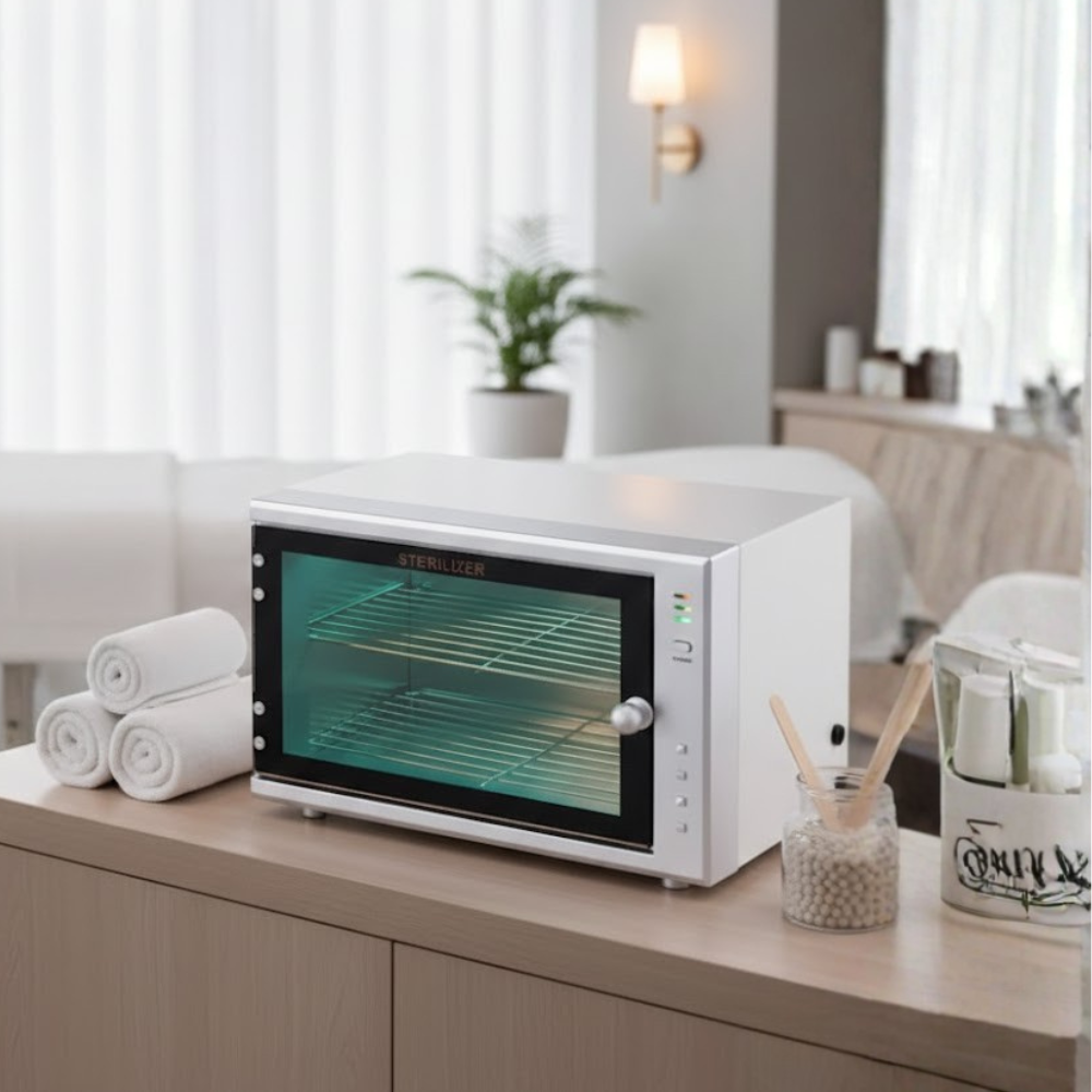 Description: ✦Multi-Purpose UV Sterilization: Effectively sterilizes combs, brushes, shears, glass tools, plastic instruments, and metal items using UV light—without heat or moisture. ✦Auto Shut-Off Safety Feature: UV light turns off automatically when the door is opened to protect users from direct UV exposure. ✦Spacious Dual-Rack Interior: Two chrome-plated wire shelves offer organized storage and ample room for multiple tools at once. ✦Tempered Glass Door with Viewing Panel: Sleek front design allows you to monitor contents without interrupting the sterilization cycle. ✦Power Indicator Lights: Simple, user-friendly interface with clear visual indicators for power and operation status. ✦Durable & Compact Build:Modern silver-and-black finish fits seamlessly into any professional setting while saving counter space.