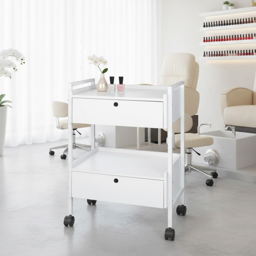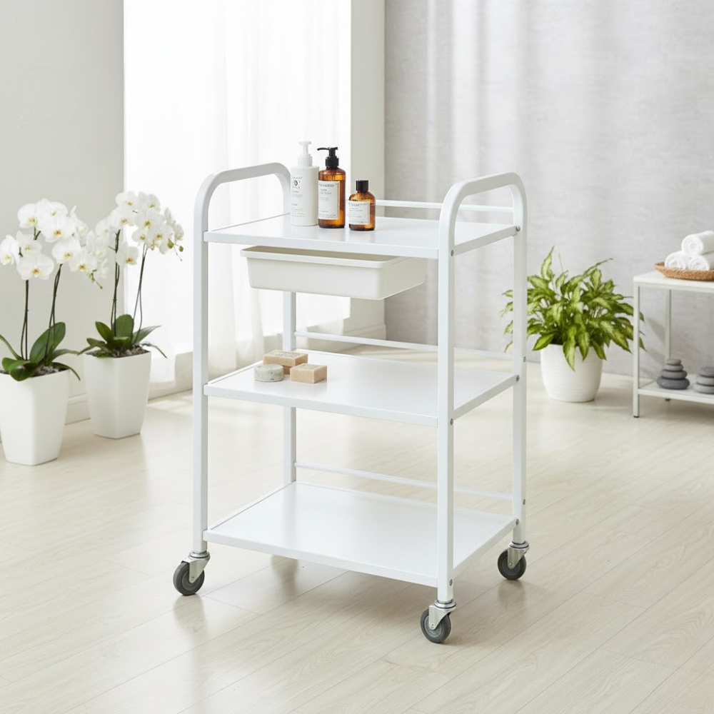 Description: ✦3 Spacious Wooden Shelves: Ideal for organizing tools, towels, equipment, and skincare products at your workstation. ✦Reinforced Steel Frame: Sturdy and reliable for daily use—built to handle frequent movement and heavy-duty supplies. ✦4 Omni-Directional Caster Wheels: Rolls smoothly in any direction and swivels effortlessly for quick, convenient mobility around treatment rooms. ✦Clean White Powder-Coated Finish: Brightens your space and complements any professional environment—easy to wipe down and maintain. ✦Compact Design with Open Access: Perfect for tight workspaces with easy access from all sides. ✦Available in Two Colors: Choose classic black or clean white to suit your workspace style.