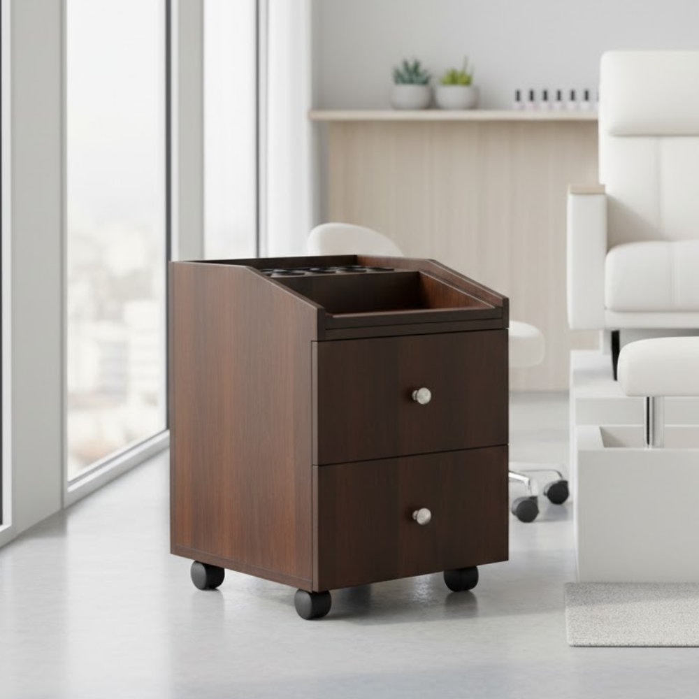 Description: ✦Sturdy & Durable Construction: Made with high-quality wood materials for long-lasting use in busy salon environments. ✦Two Smooth-Glide Drawers: Deep drawers provide ample storage for tools, towels, and accessories while keeping your station organized. ✦Built-In Appliance Holders: Top panel features multiple heat-resistant ring inserts—ideal for holding curling irons, blow dryers, and styling tools. ✦Spacious Top Tray Surface: Offers additional space for working tools or frequently used products during treatments. ✦Smooth-Rolling Wheels: Moves easily between rooms or stations—perfect for mobile service flexibility. ✦Rich Cherry Wood Finish: Adds a professional, upscale look that complements both modern and classic interiors.
