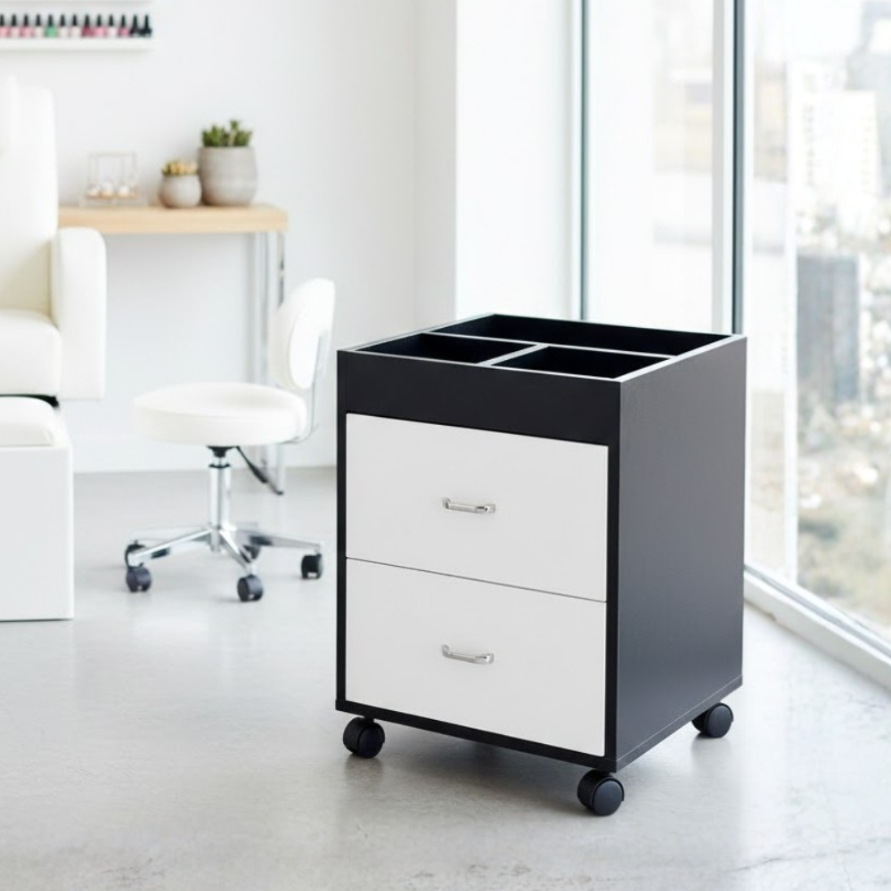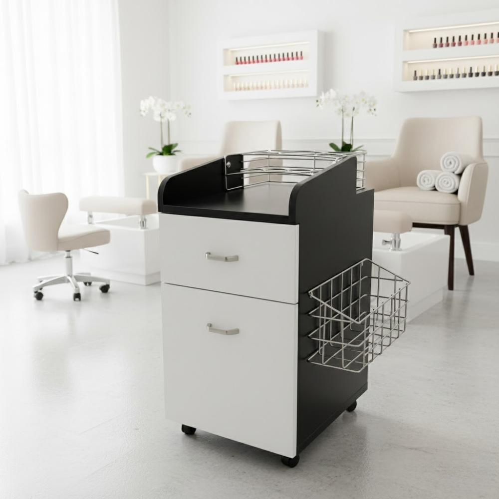Description: ✦Spacious Top Tray with Appliance Holders: Built-in metal ring inserts securely hold hot tools like blow dryers, curling irons, and flat irons. ✦2 Smooth-Glide Drawers: Large-capacity drawers for storing tools, brushes, towels, and more—easy to open and built to last. ✦Side Wire Basket: Additional storage for bottles, brushes, or supplies you need within quick reach. ✦Smooth Rolling Wheels with Locking Casters: Easily glide from one room to another, then lock in place for secure positioning during use. ✦Modern Two-Tone Finish (Black & White): Professional appearance with contrasting tones that suit both clinical and creative workspaces.
