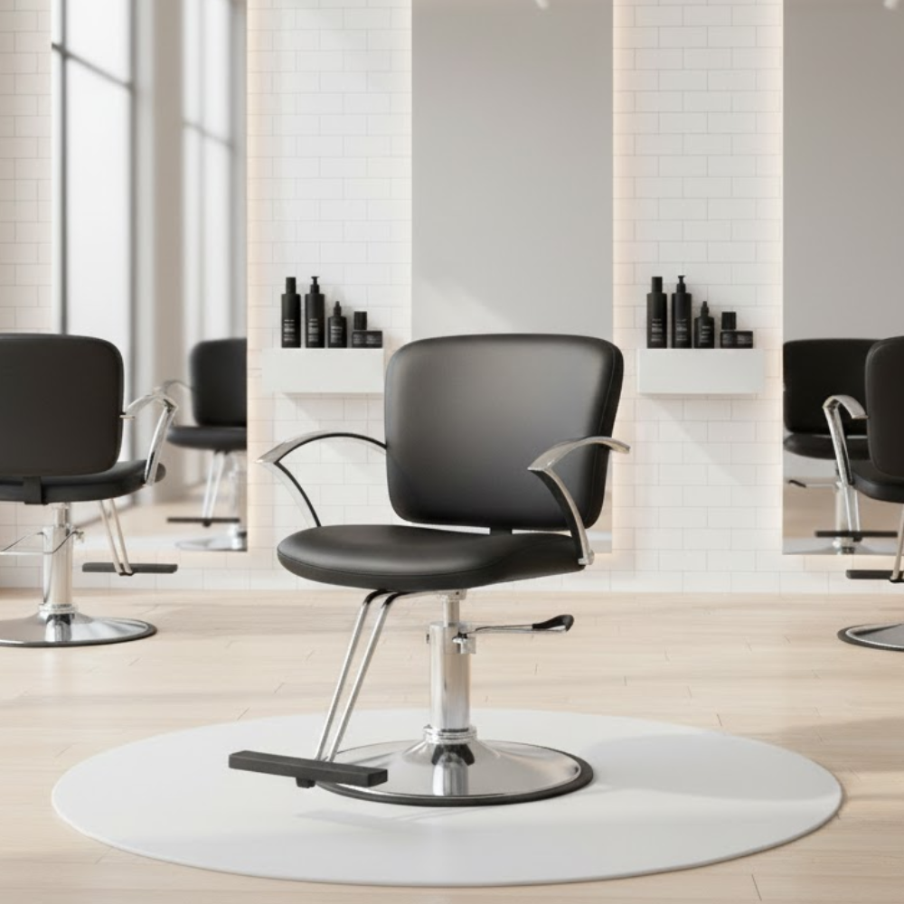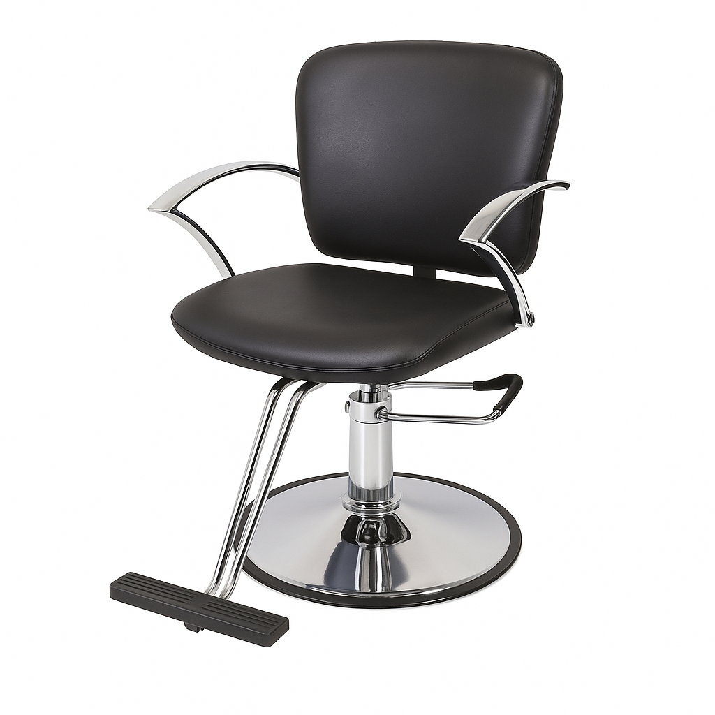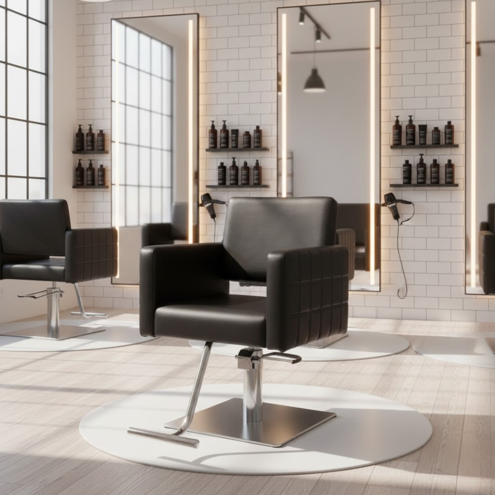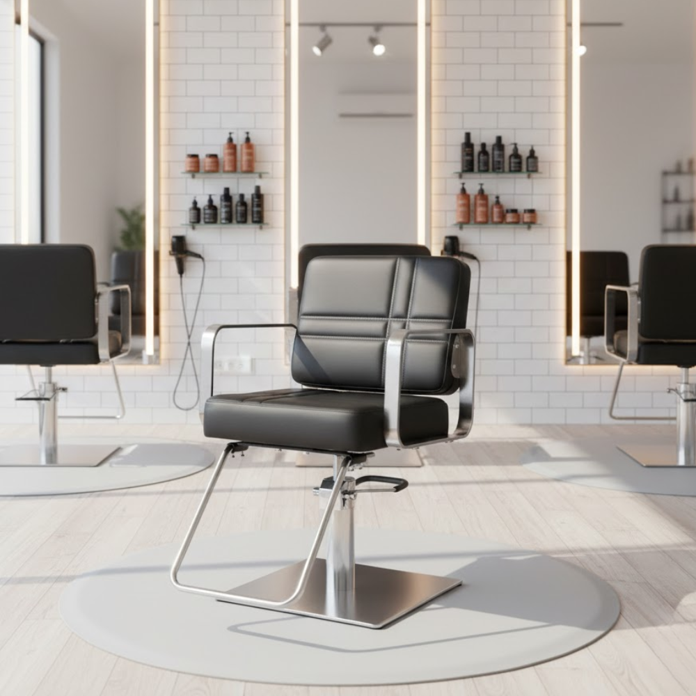 Description: ✦Seat Size (W x D): 20” x 19”: Designed for client comfort with plush cushioning and a spacious seating area. ✦Adjustable Seat Height: 20” – 26”: Hydraulic mechanism allows for seamless seat height adjustment to suit any stylist’s needs. ✦Contemporary Frame with Brushed Metal Armrests: The bold, square arm design adds a modern edge while providing sturdy support. ✦Square Stainless Steel Base: Offers a strong foundation and elegant appearance—perfect for upscale interiors. ✦Integrated Footrest for Added Comfort: Keeps clients relaxed during every service session.