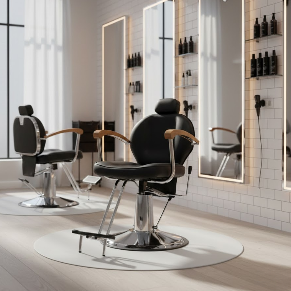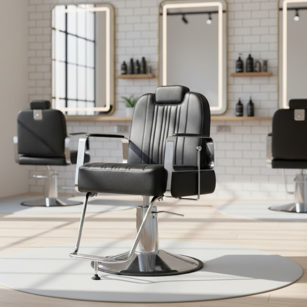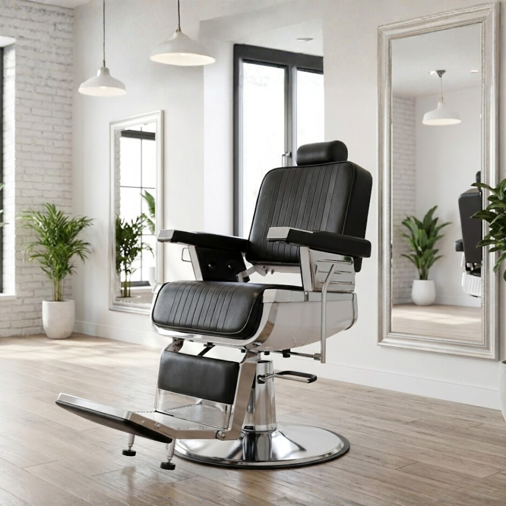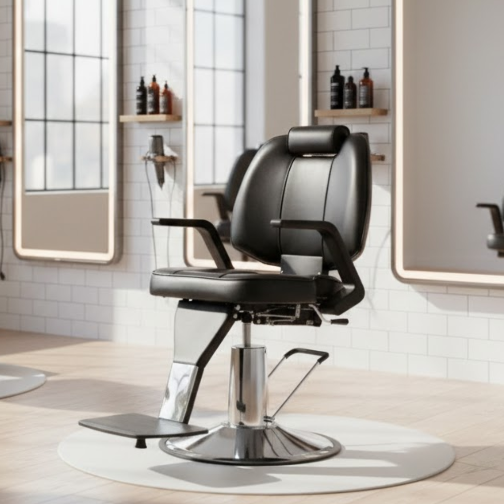Description: ✦Seat Size (W x D): 18” x 21”: Generously padded seat with vertical stitch detailing for added style and client comfort. ✦Adjustable Seat Height: 23” – 28”: Hydraulic lift system allows easy height customization to suit your service angle and client height. ✦Reclining Backrest & Adjustable Headrest: Ideal for precision grooming and full recline comfort during shaves, trims, and treatments. ✦Heavy-Duty Chrome Base & Footrest: Offers ultimate stability and support with a stylish vintage flair. ✦3-Month Limited Warranty (Discounted Price): Backed with a short-term warranty for added confidence at a budget-friendly value.