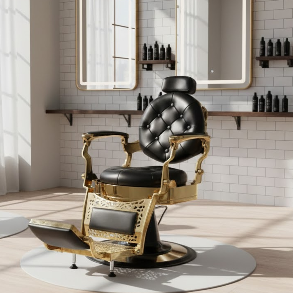 Description: ✦Seat Size (W x D): 19” x 20”: Wide, round seat with plush cushioning ensures client comfort with vintage flair.✦Adjustable Seat Height: 23” – 27”: Reliable hydraulic system allows smooth height adjustment for optimal working angles. ✦Fully Reclining Backrest with Adjustable Headrest: Ideal for shaves, facials, and detailed grooming—offers full client support and flexibility. ✦Premium Gold Frame Finish: Eye-catching metallic structure adds bold sophistication and is built for durability in high-use environments. ✦Flip-Up Footrest with Calf Support Pad: Enhances client comfort and stability during services. ✦360° Swivel Base with Locking Mechanism: Provides full rotation and secure positioning during use.