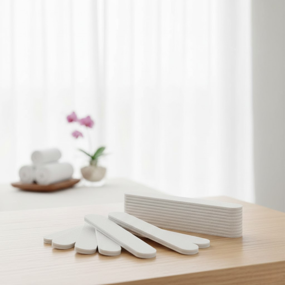 Description: $0.05 / pc ✦Available Grits: 80/100, 100/180, 180/240 ✦ Disposable – hygienic and ideal for one-time professional use ✦Professional-Grade – delivers smooth, even sanding for flawless nail prep ✦ Compact Size – easy to grip, perfect for detailed work